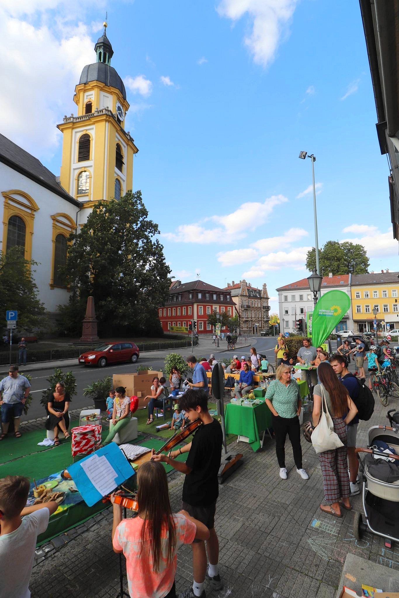 Aus acht tristen Parkplätzen in der Kaiserstraße zauberten die Veranstalter von VCD, Grünen und ADFC beim „Parking Day“ am 15.09. vorübergehend einen bunten Lebensraum. Viele Familien und Mobilität-Interessierte nutzten die Gelegenheit zum entspannten Gespräch oder einem Drink im Liegestuhl, während die Kinder spielten, musizierten und bastelten, wo sonst Autos den Platz beanspruchen. Besonders das Kinderschminken erfreute sich großer Beliebtheit. Pianist Ralph Sarömba, Marita Schwab und ihre Klavierschüler und -schülerinnen sowie Julian Glienke (Geige) begleiteten den Nachmittag mit Rock, Pop und Klezmer-Musik. Musiklehrerin Mary Lynn Zack und ihre Streichorchester überraschten mit einem musikalischen Flashmob.